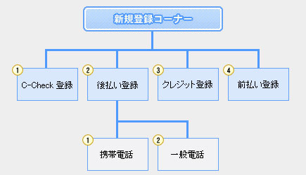 前払いの「C-Check登録」「クレジット登録」「銀行振込登録」、後払いの「後払い登録一般電話」「後払い登録携帯電話」から登録方法を選べます。